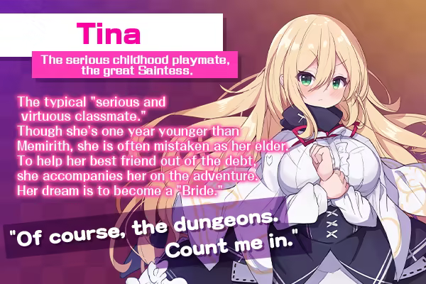 An RPG about the protagonist "Memelis," who is deep in debt. Because she spent everything she has on card lottery in mobile games, Embarks on an adventure with her best friend "Tina" to find the treasure hidden in the depth of dungeons.