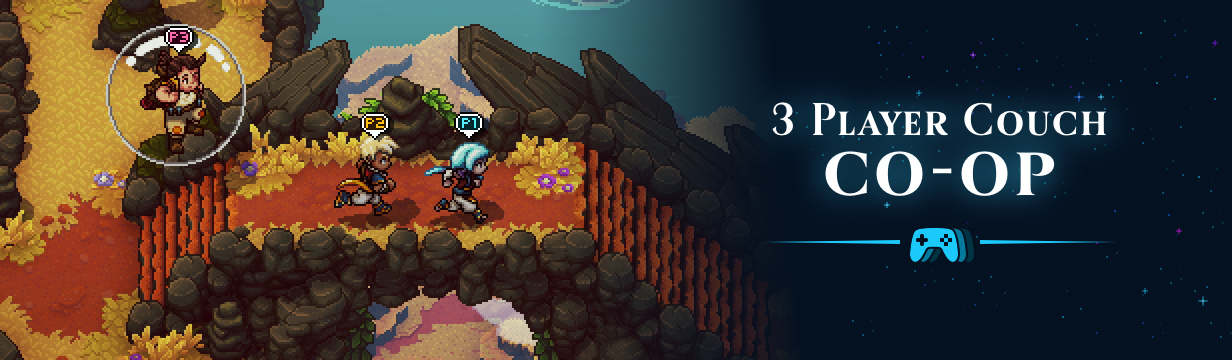 Sea of Stars’ adventure is playable in its entirety by up to three players. Allies can drop in and out anytime to traverse the world together and master the Co-op Timed Hits combat mechanic. Also available via Steam Remote Play Together.