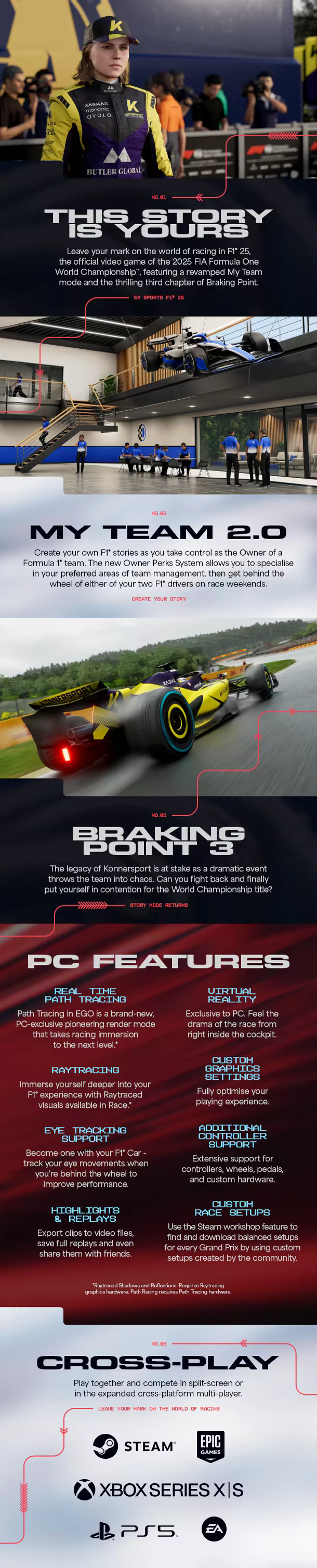 Leave your mark on the world of racing in F1® 25, the official video game of the 2025 FIA Formula One World Championship™, featuring a revamped My Team mode, the thrilling third chapter of Braking Point, and more!