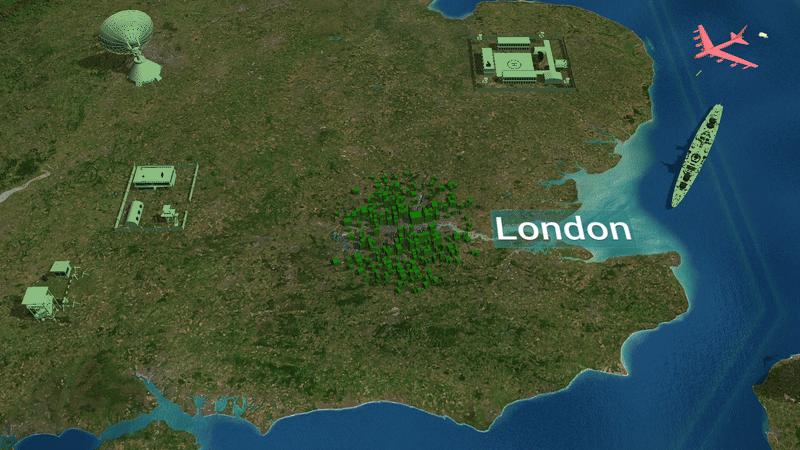 A detailed 3D map featuring hundreds of cities and strategic targets