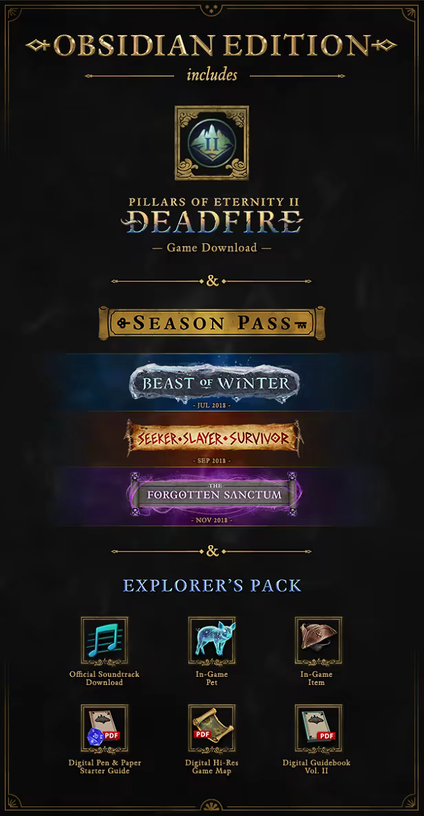 • SEEKER, SLAYER, SURVIVOR (Sep 2018):Far from the bustling trade lanes of the Deadfire Archipelego, the most ambitious warriors of Eora gather to compete for divine favor. (post-launch content, a $10 value)
