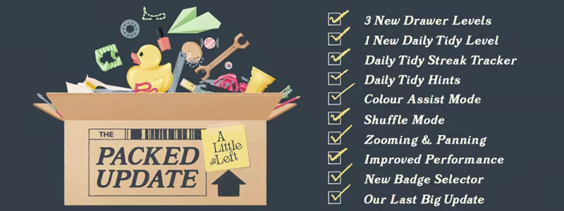 A Little to the Left now features a puzzle Archive, granting permanent access to the formerly limited-time seasonal levels. Now enjoy messes based around Xmas, Easter, Halloween, and more, no matter the month.