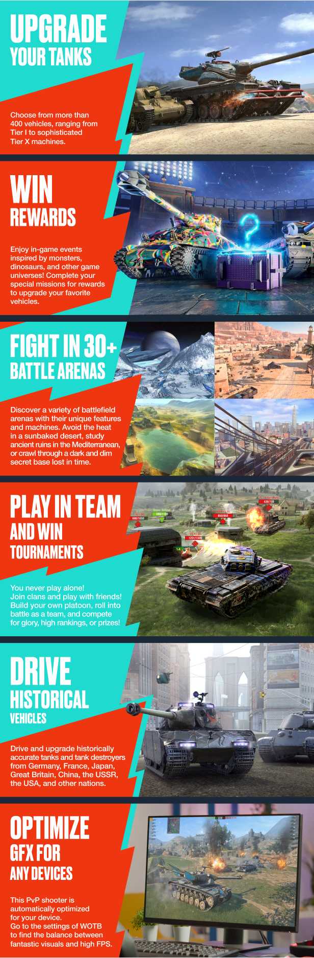 Tanks, not war: jump into a free-to-play MMO action shooter with over 400 tanks. Enjoy stunning graphics and intuitive touch controls. Engage in 7vs7 battles, strategize with your team to conquer diverse maps. Customize tanks, unlock upgrades, and dive into adrenaline-pumping action on mobile and PC